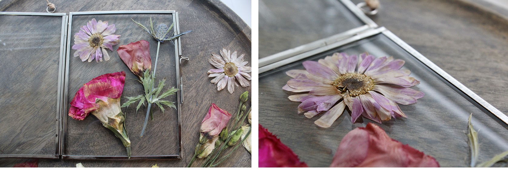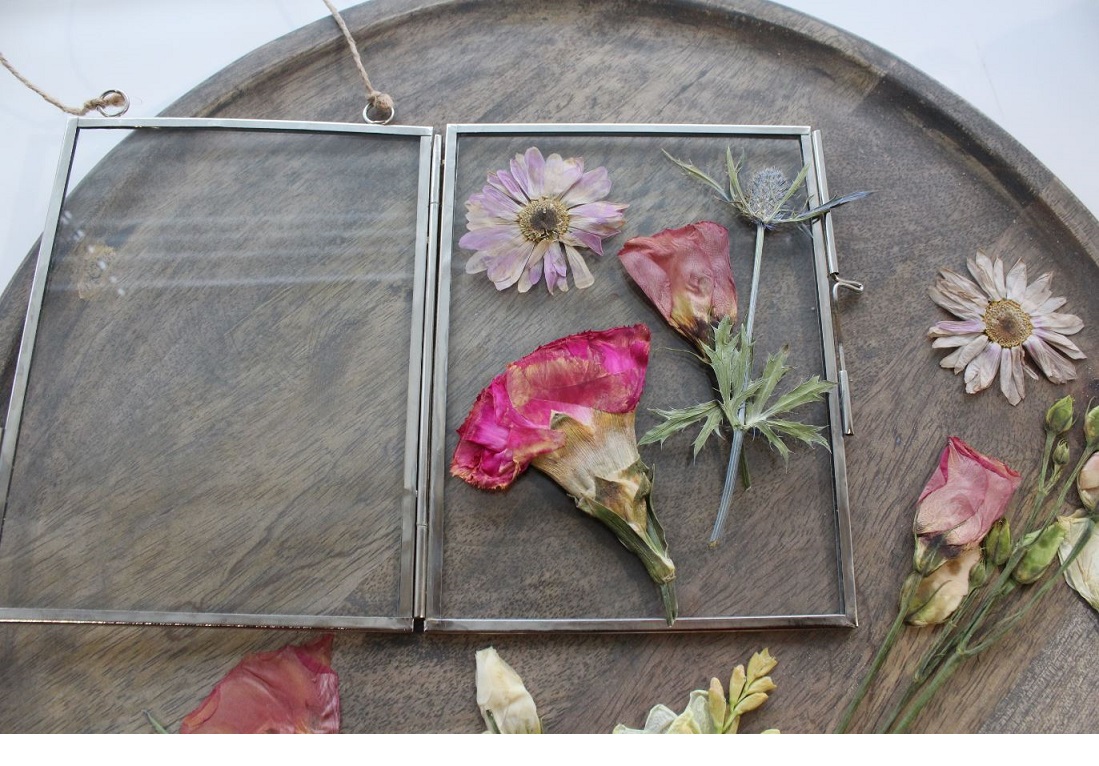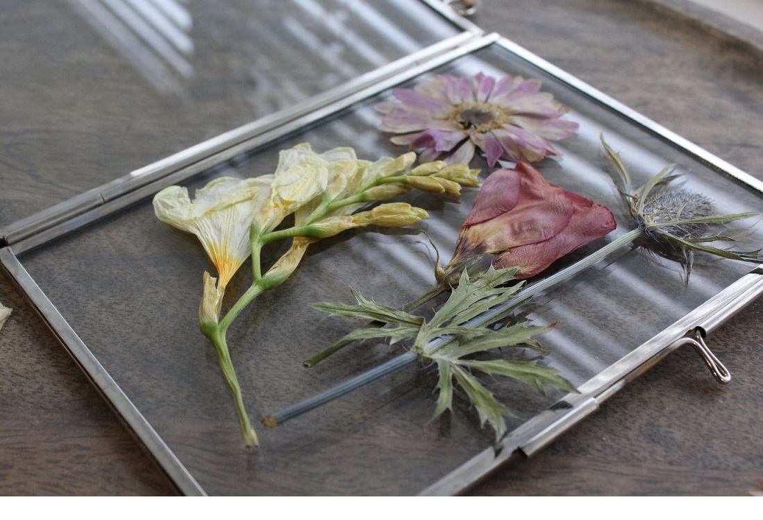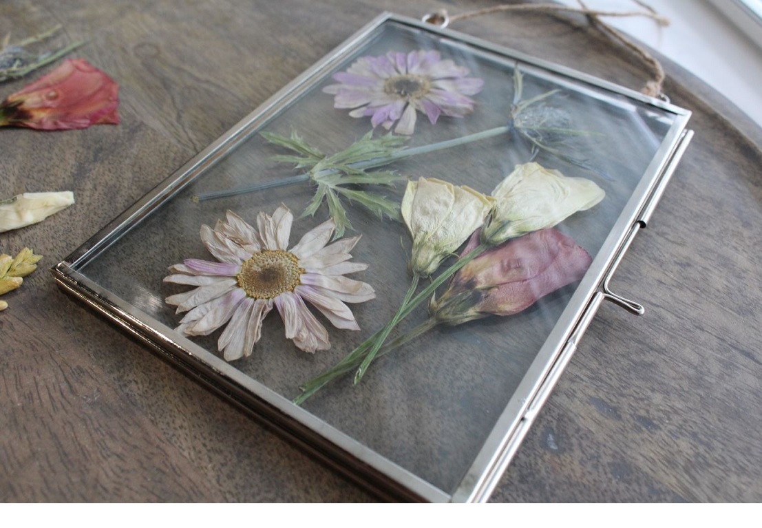 From here, select which of your flowers have kept their vibrancy the most, and arrange in your open glass frame. Make sure you’ve made the right decision before closing the frame as flowers may be hard to remove once compressed.