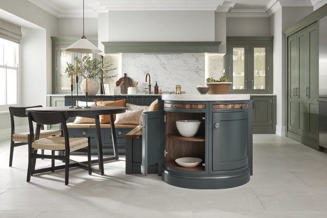 Elevate your kitchen look with our two curved door styles, perfect for bringing a soft statement to any space. The True Curve design features a single curved cabinet door for seamless fluidity, and a refined integrated chopping board in natural oak or walnut allows for functional zoning in a kitchen layout. Pair two True Curve doors together for a statement barrel feature to command the attention of any room. Our second style, the Double Curved Door design features a gentle curve, perfect for creating a symmetrical, oval island end for classic refinement. Which curved style is for you?