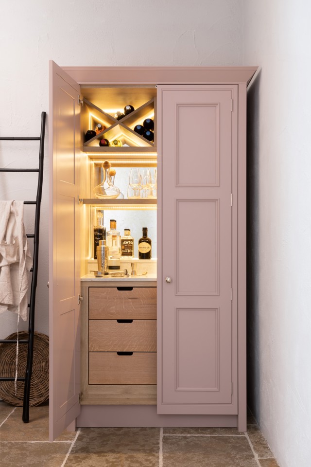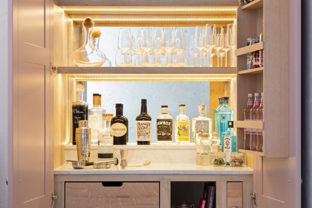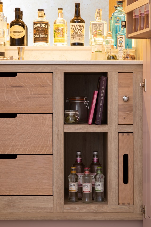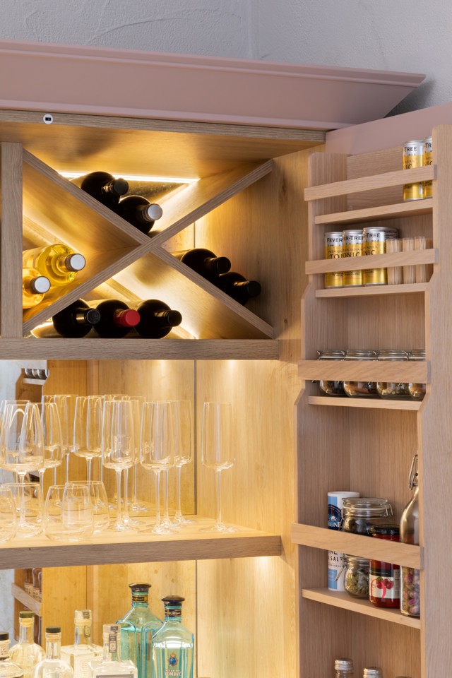 Behind the doors of the Drinks cabinet is a treasure trove of tailored storage. With cross bottle holders, open-shelving, dovetail drawers, an integrated chopping board and serving tray, and door racks for displaying your favourite mixers, the cabinet offers you a special place for each and every one of your home bar essentials.
