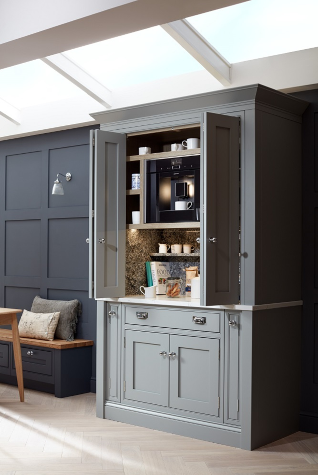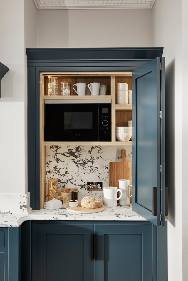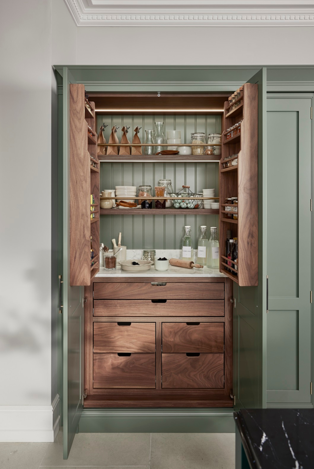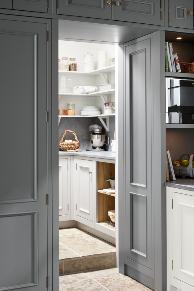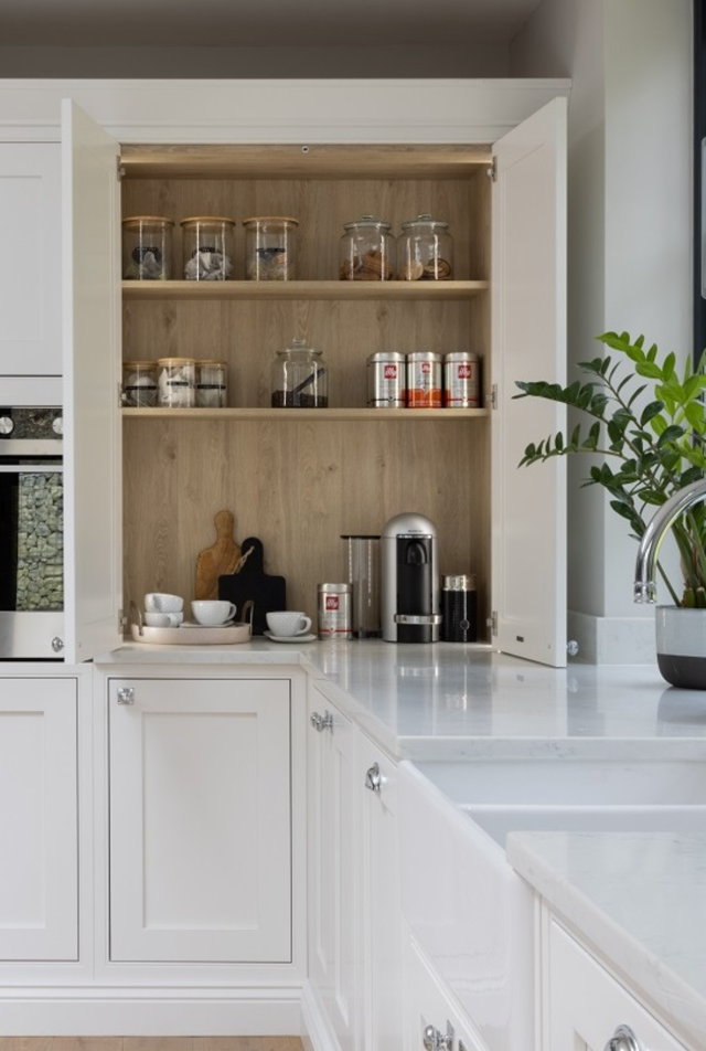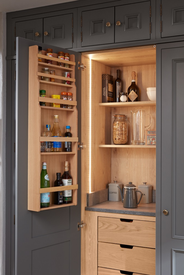 Equal in beauty and practicality, the humble kitchen pantry is a cupboard with a difference. The perfect home for your morning essentials; benefit from your kitchen pantry by letting it house everything from integrated coffee machines and microwaves, to dry goods and your ever-growing collection of cookery books. All will be neatly concealed behind a pair of expertly crafted classic or bi-folding doors. Tailored washed oak internals and warming LED lighting mean your kitchen pantry can make a statement on the inside as well as the outside. Kitchen pantries can be built into your kitchen setup, be a standalone feature piece or even become a walk-in pantry if space isn't at a premium. You can make your kitchen pantry a decorative feature whilst also having it function as the hub of your kitchen storage.
