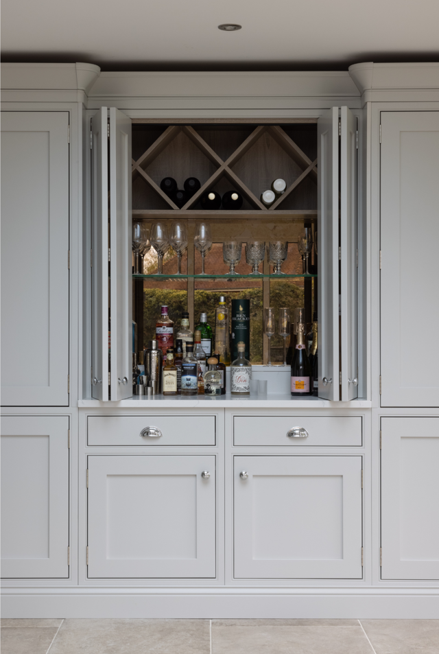 The 1909 drinks cabinet is our exquisitely crafted, free-standing feature cabinet- a statement piece of furniture that will bring an element of luxury to any night in. Featuring a three-panel door as part of our in-frame Shaker and Ovolo styles, and shown here with beautiful Georgian beading, the cabinet design gives a nod to heritage styles and demands the attention of the room with its traditional sophistication.
