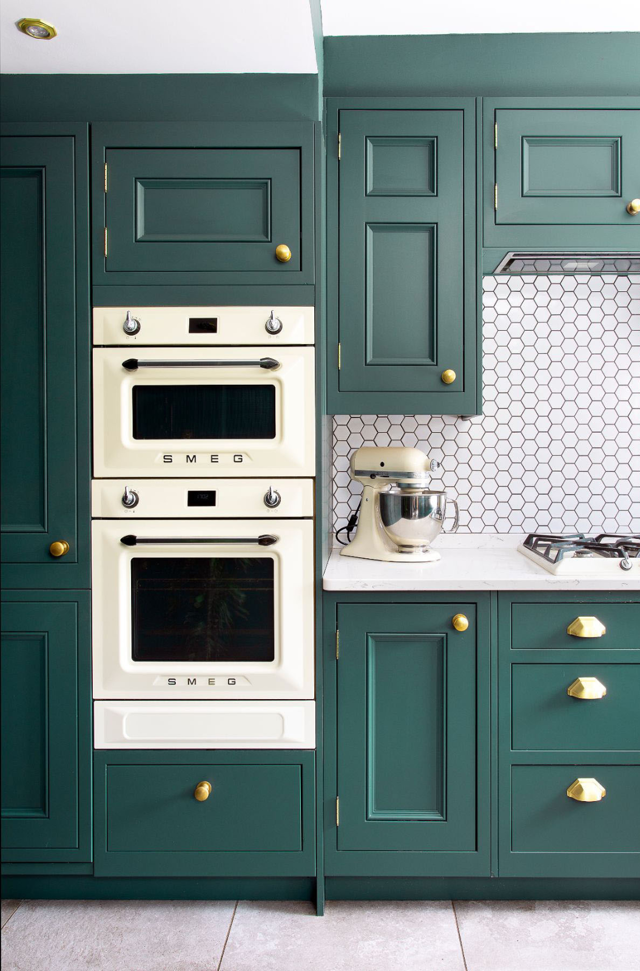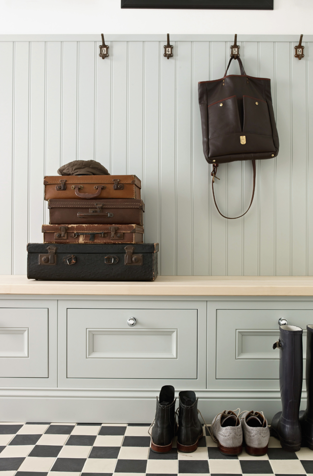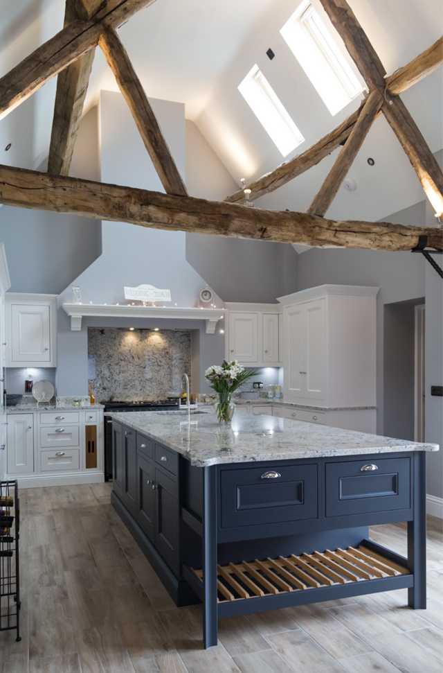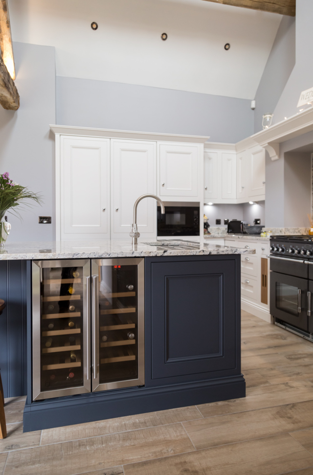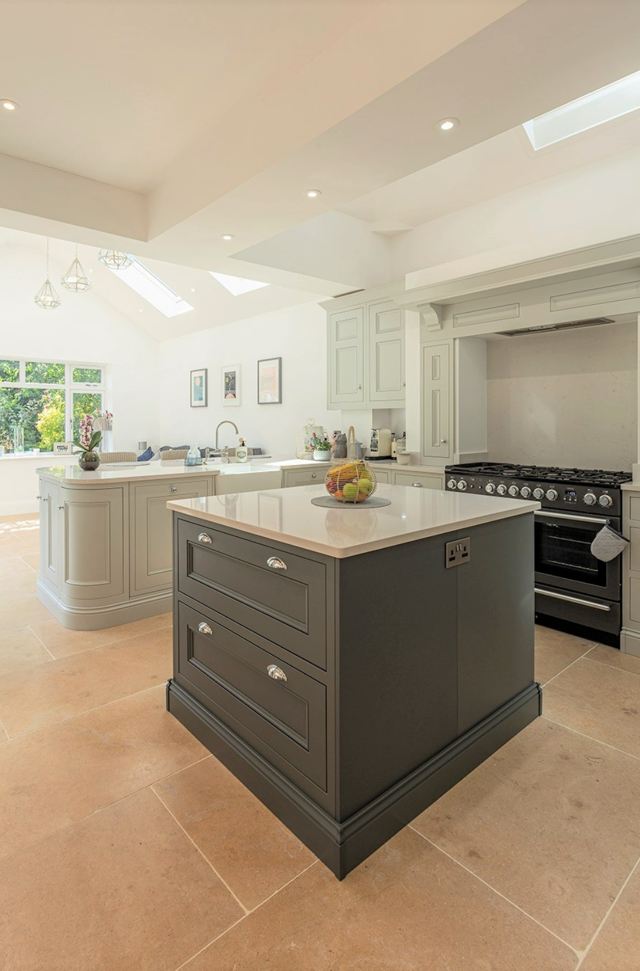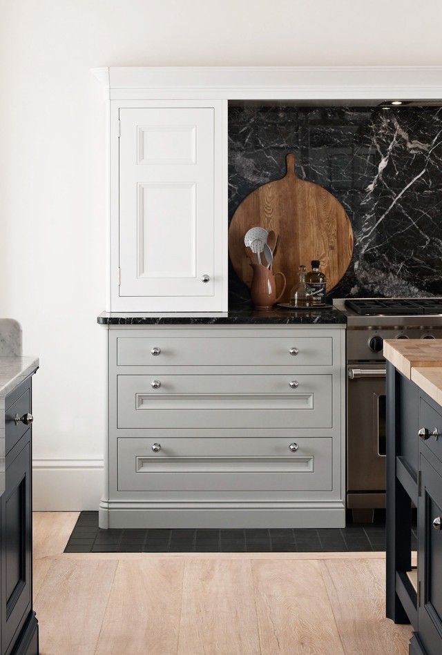 The detailed Half Pencil & Scalloped door works beautifully in this characterful period kitchen, featuring a distinguished palette of bold Charcoal, soft Partridge Grey and soothing Chalk. The combination of moulded plinth, traditional cornice and framing feature mantle all combine to show what this furniture style does best – classic, formal, stately design.
