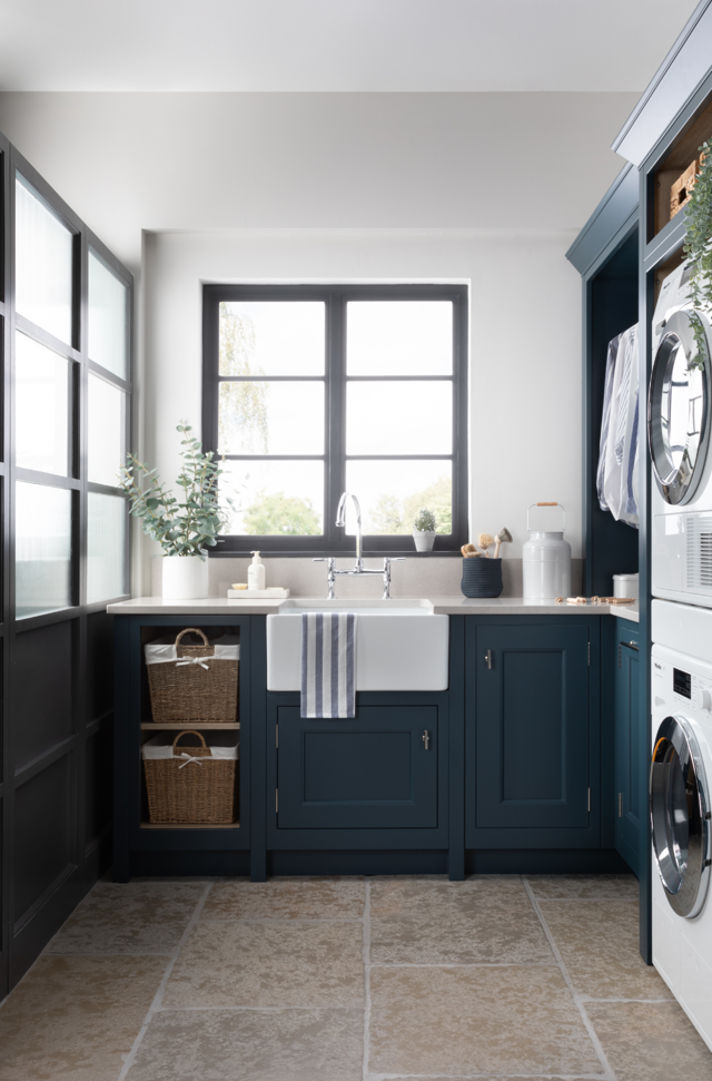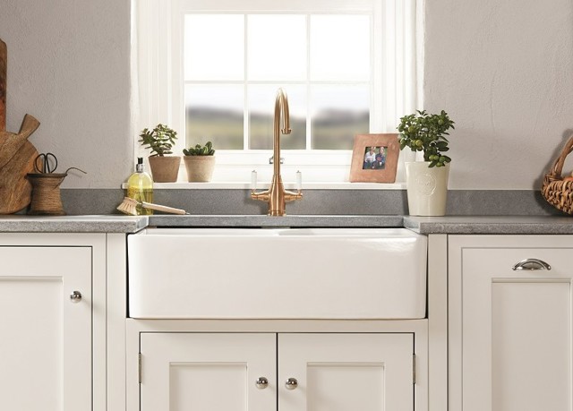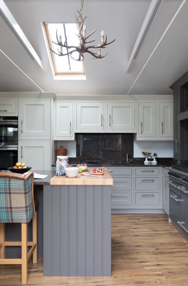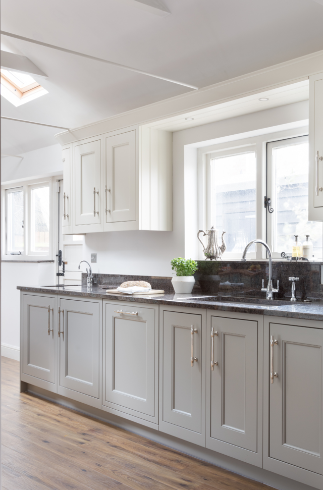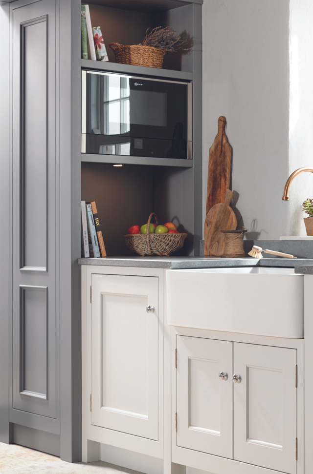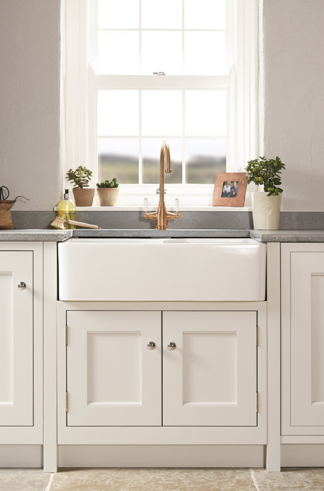 A soft Quarter Round beading deserves a colour palette equally as gentle, such as this delicate Dove Grey kitchen. Combining a mix of chrome cup and knob handles, classic butt hinges, and a Belfast sink, this style embraces a warming farmhouse look, creating a calming, timeless environment which suits the character of the room perfectly.
