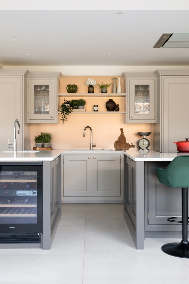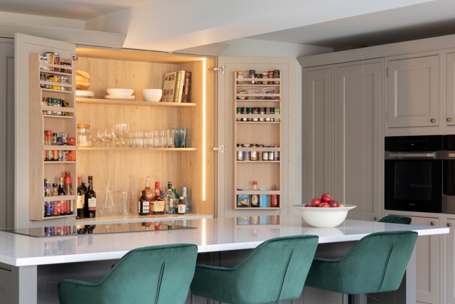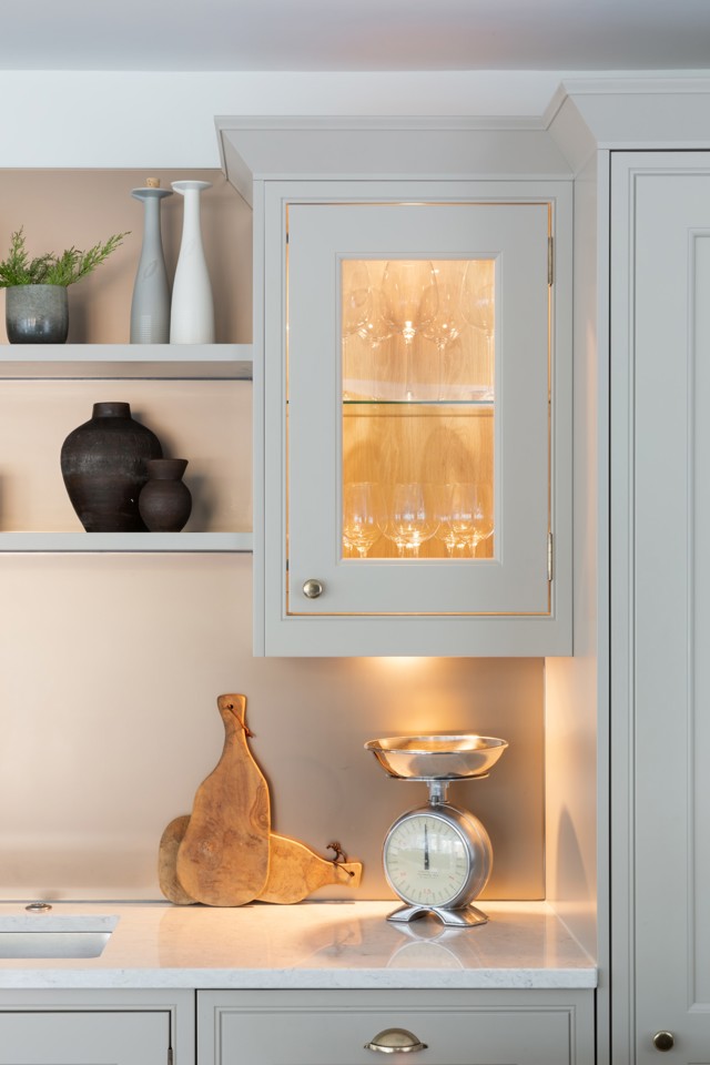 Lighting is used throughout this beautiful design to illuminate focal features, such as the statement pantry and the elegant glazed cabinetry, bringing a depth and warmth to the open-plan space.
