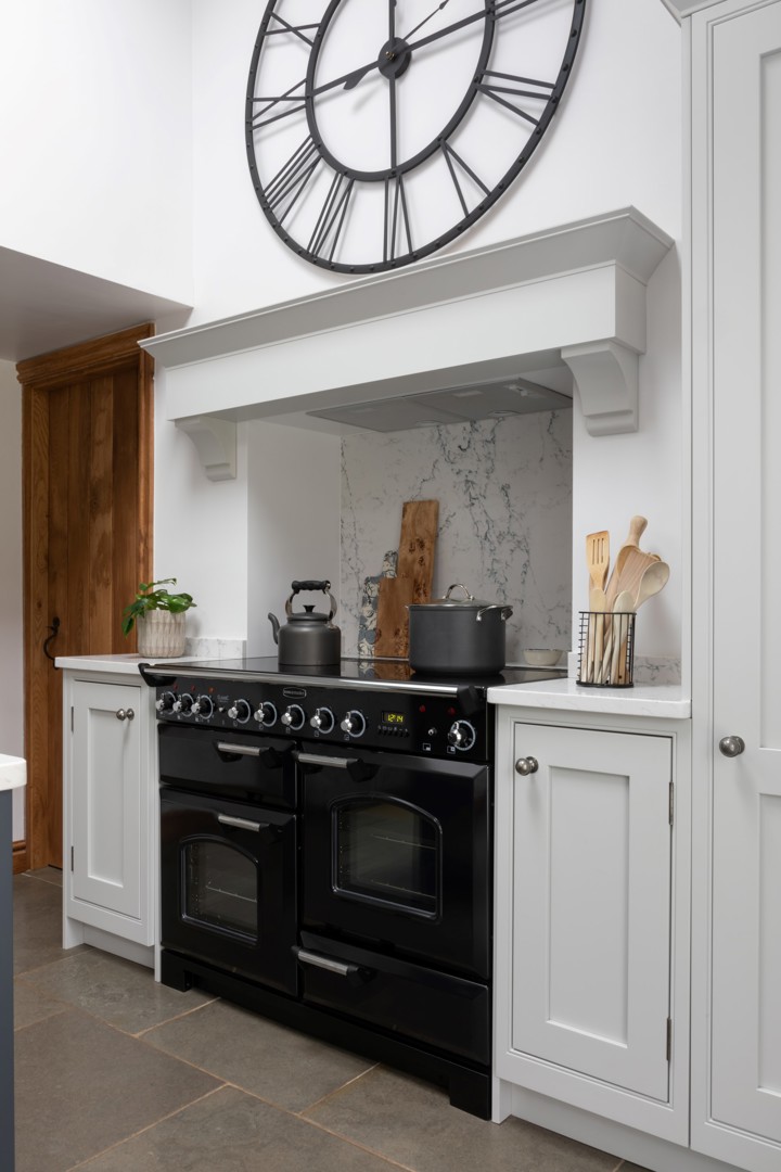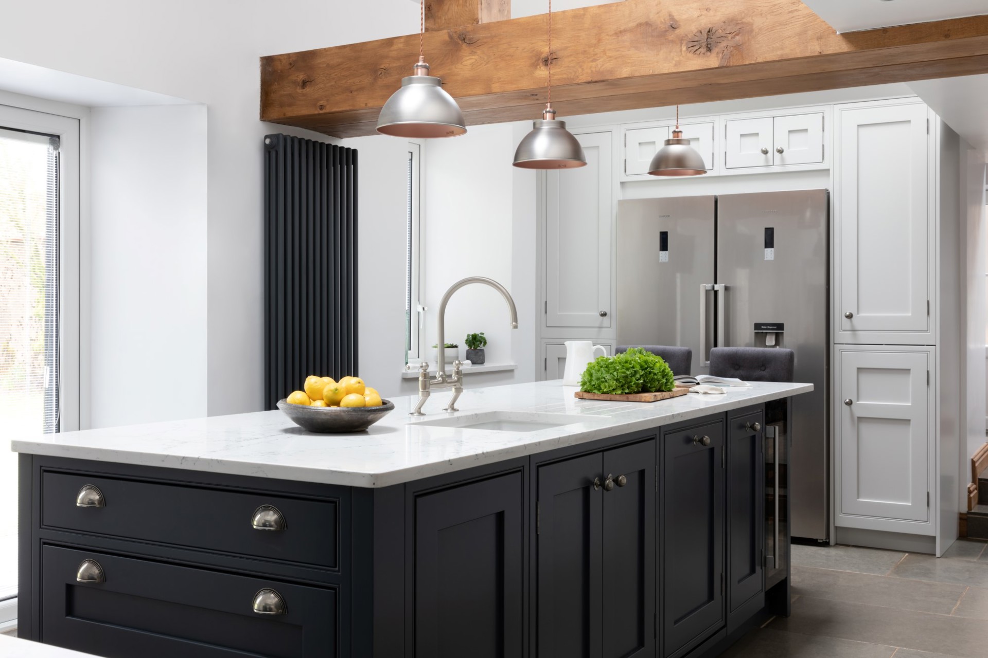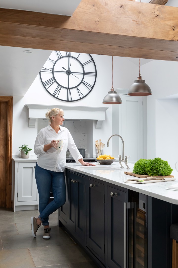Sarah and Adrian chose an Ovolo door to bring a timeless elegance to this modern, country-style kitchen design in Cumbria, painted in a beautifully contrasting palette of Charcoal and Dove Grey.