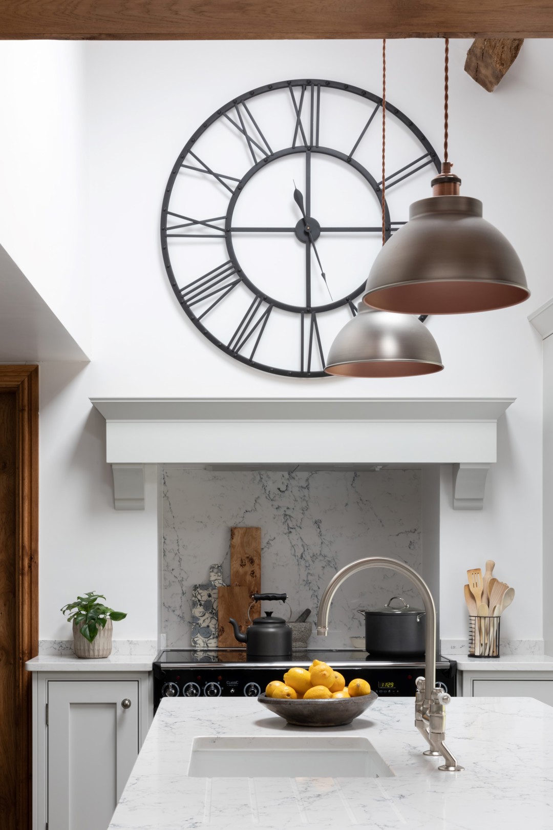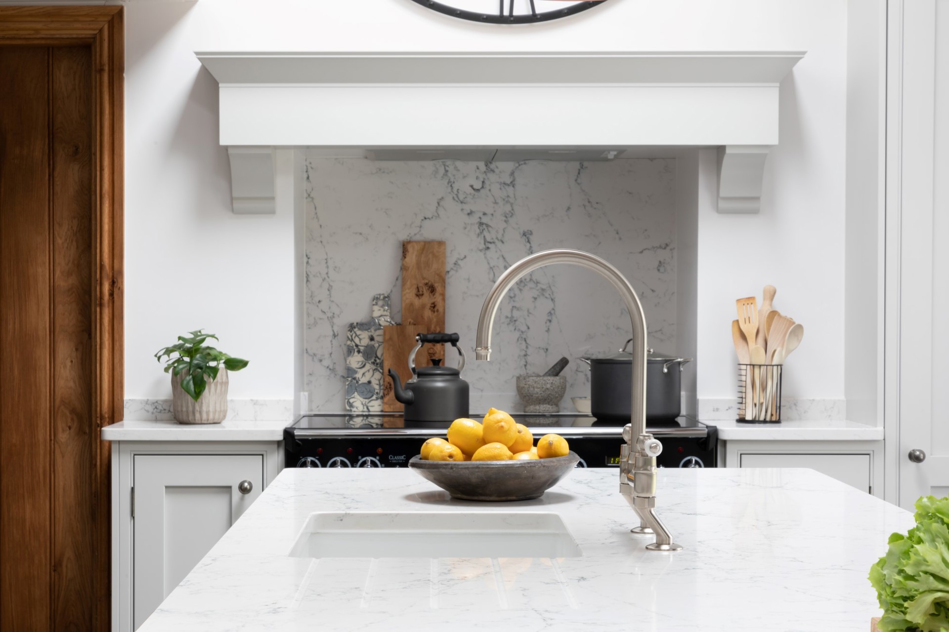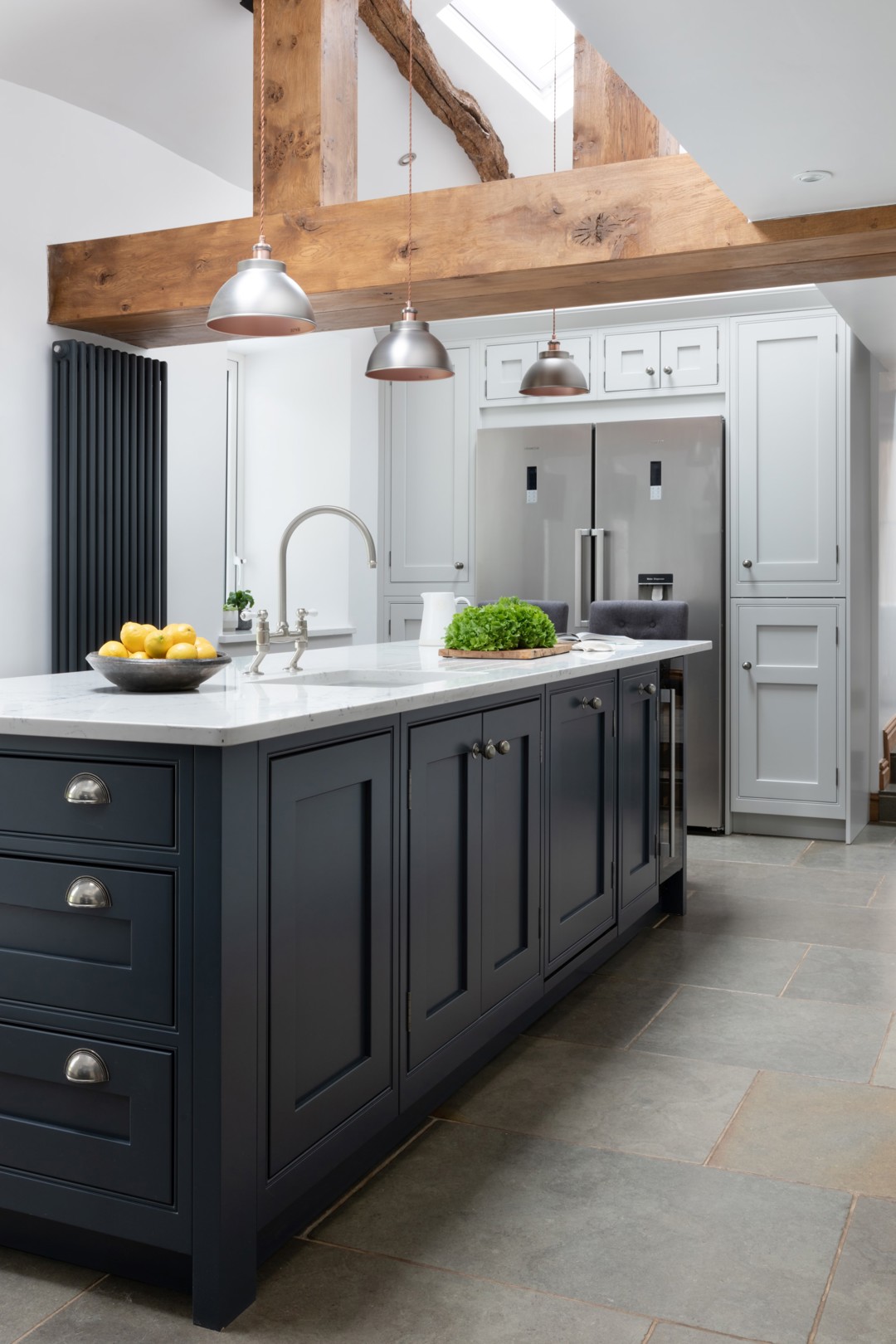 Sarah and Adrian chose an Ovolo door to bring a timeless elegance to this modern, country-style kitchen design in Cumbria, painted in a beautifully contrasting palette of Charcoal and Dove Grey.