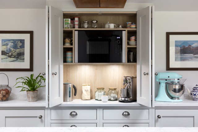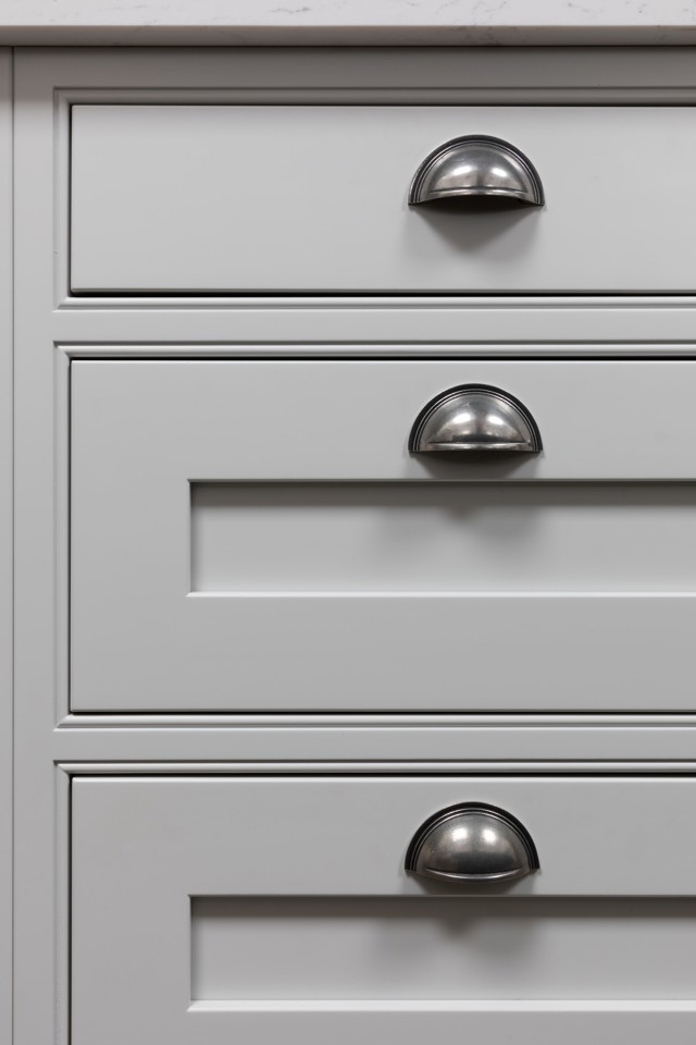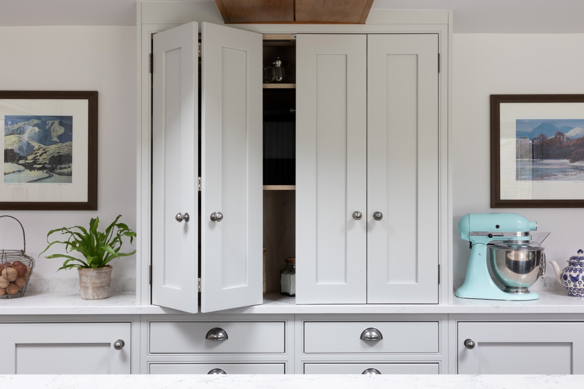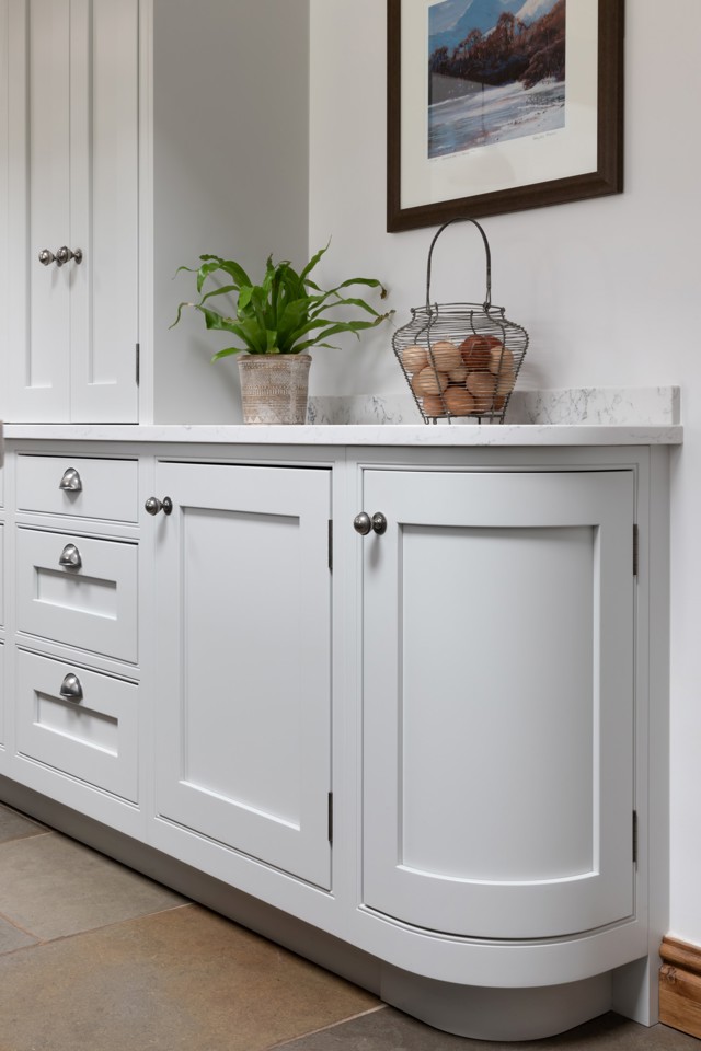 Traditional pewter handles, a statement bi-fold pantry, and timeless curves, soften and complement the sleek, understated detail of the Ovolo design.