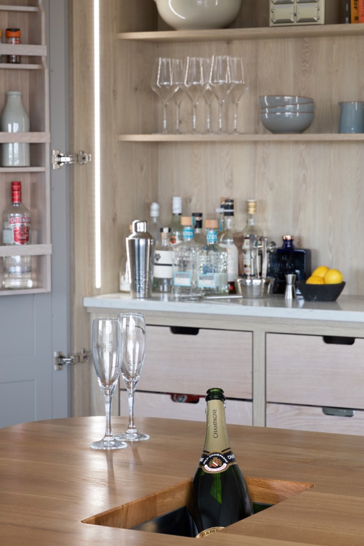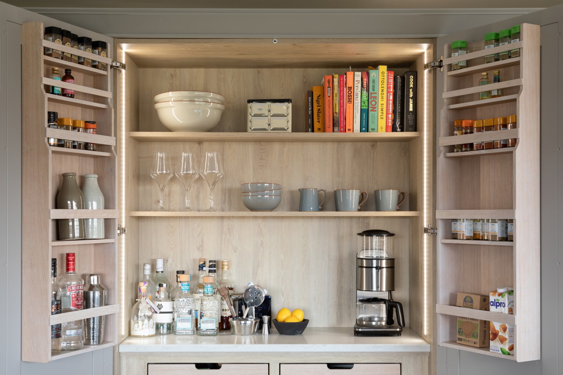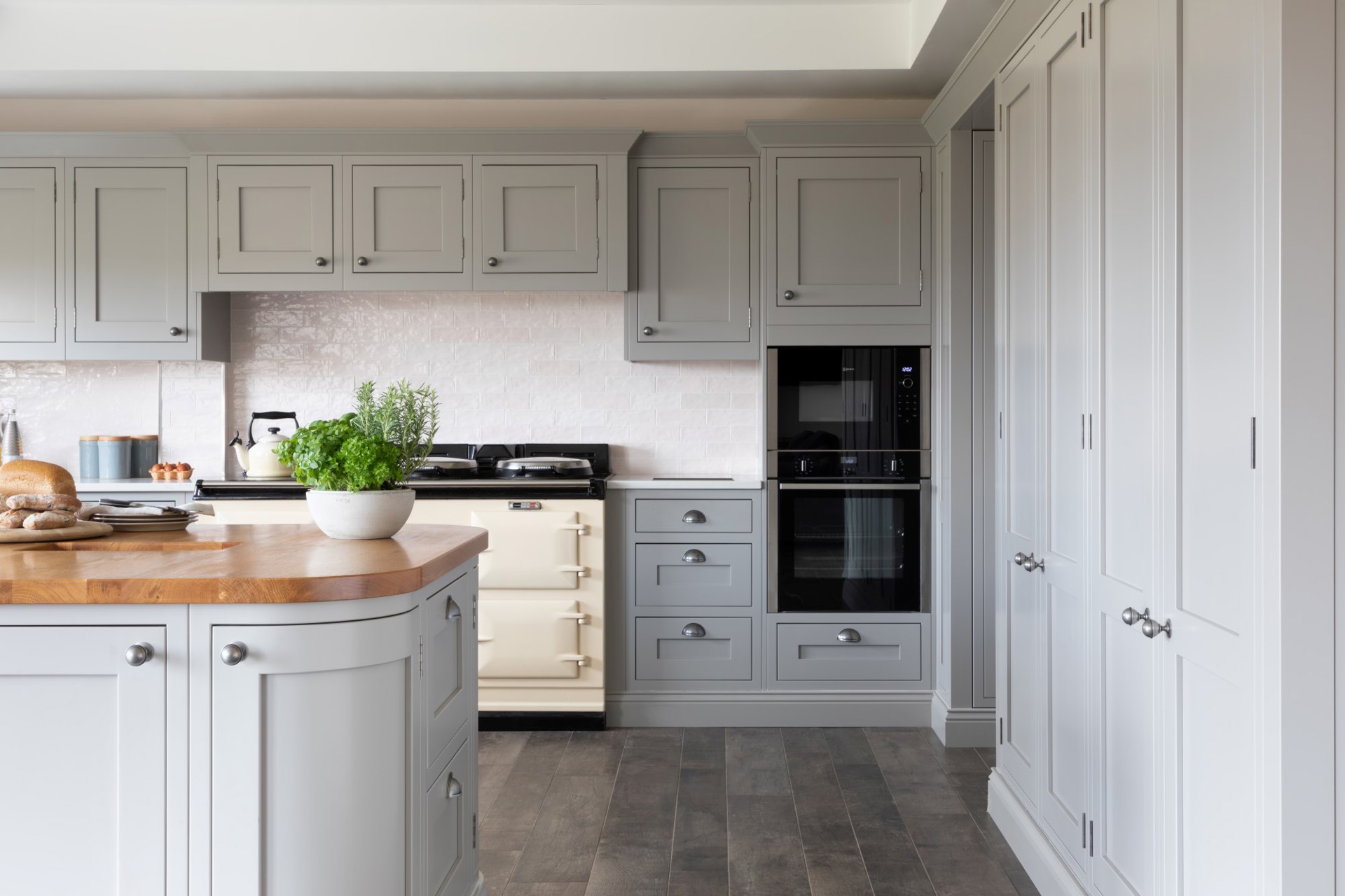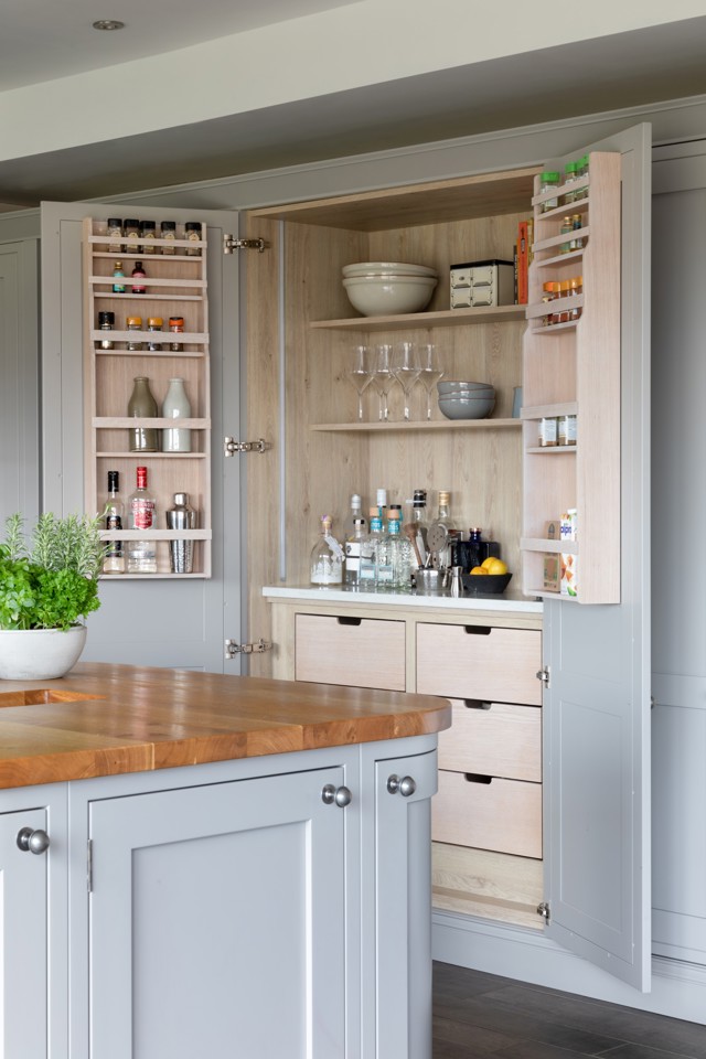 1909 furniture fully wraps this elegant kitchen from floor to ceiling in a calming single hue, with both statement pantry storage and smart every day storage to accommodate the family's every need.