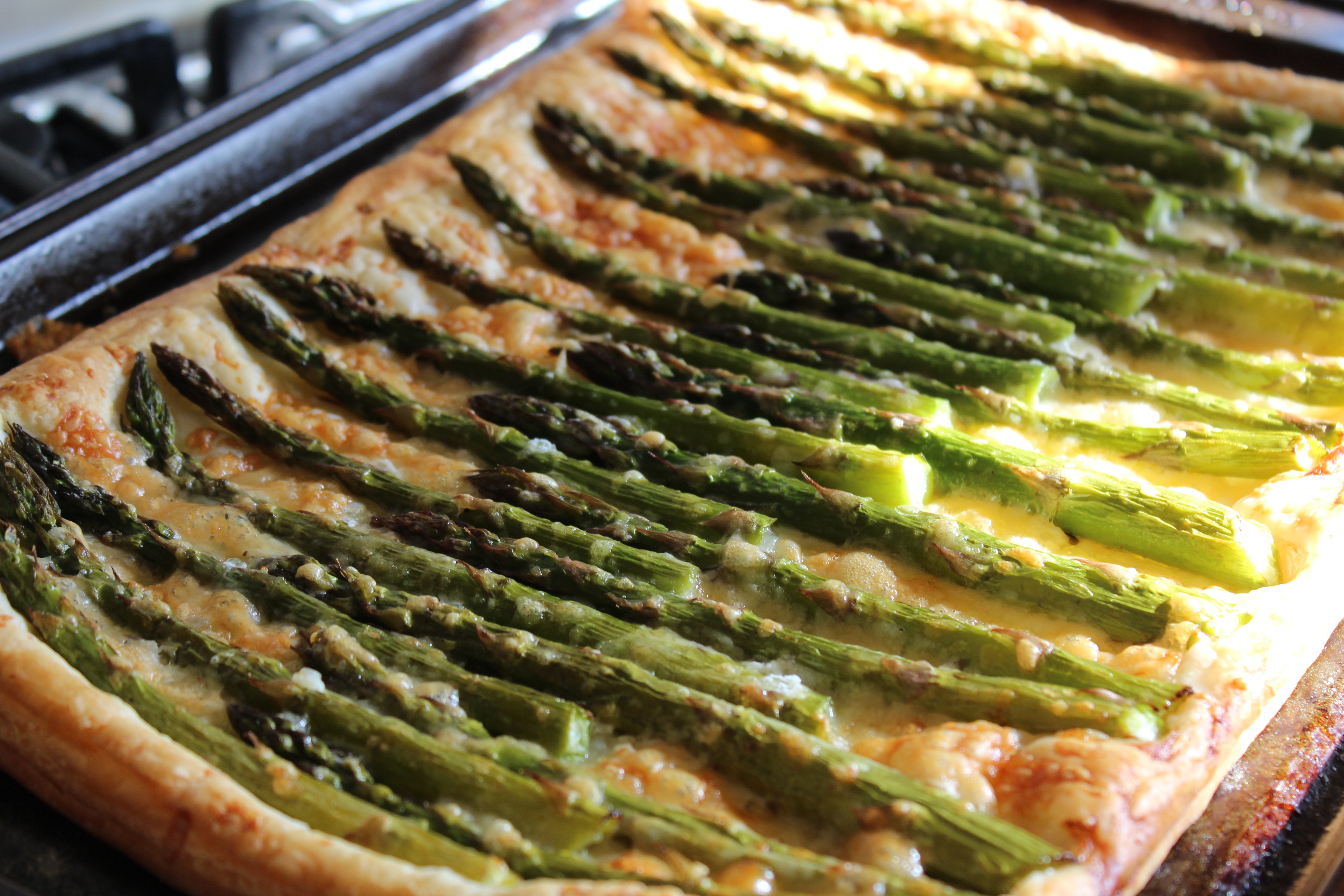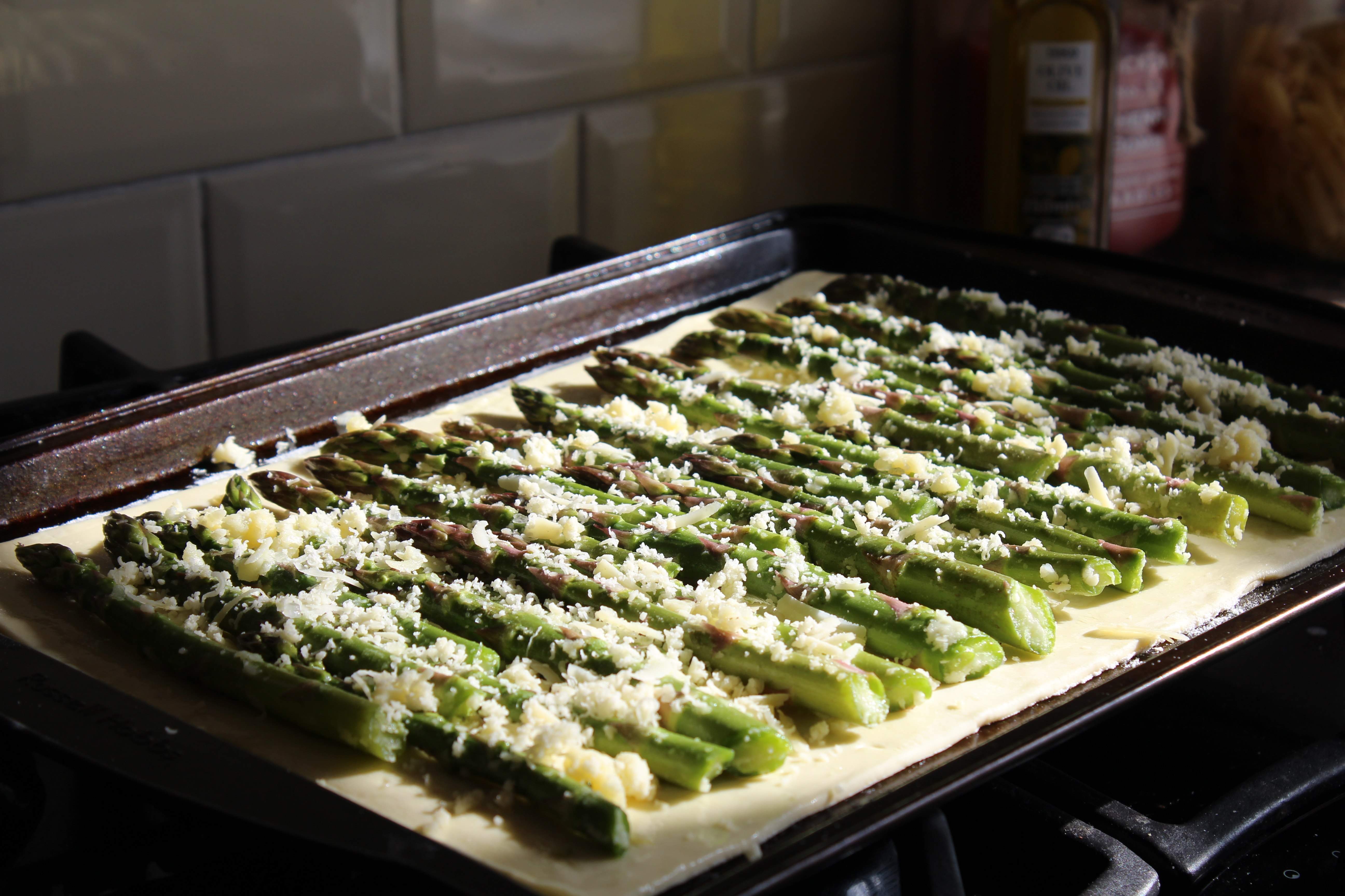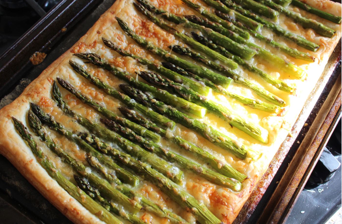 Next, place your asparagus in a single layer on the pastry, leaving a small margin around the edge to allow for a defining crust and to make it easier to hold when eating!