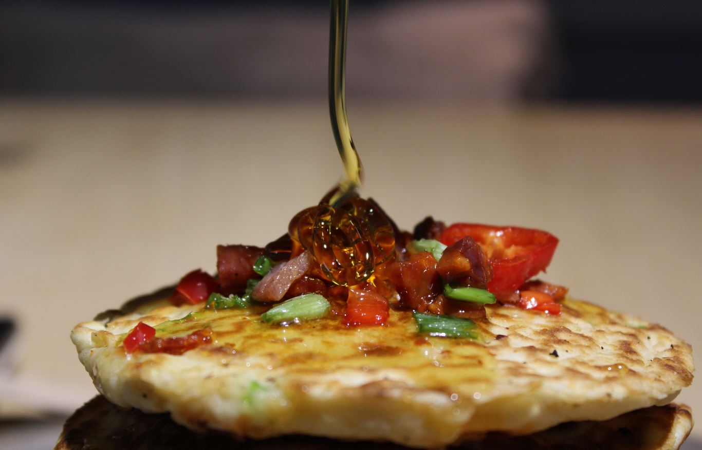 When your pancakes are cooked, stack up as high as you’d like and add a tsp (or as much as you like) of chilli butter to the top, so it will melt down. Then sprinkle on your bacon and add any extra chorizo, cheese, spring onion, and golden syrup to taste.