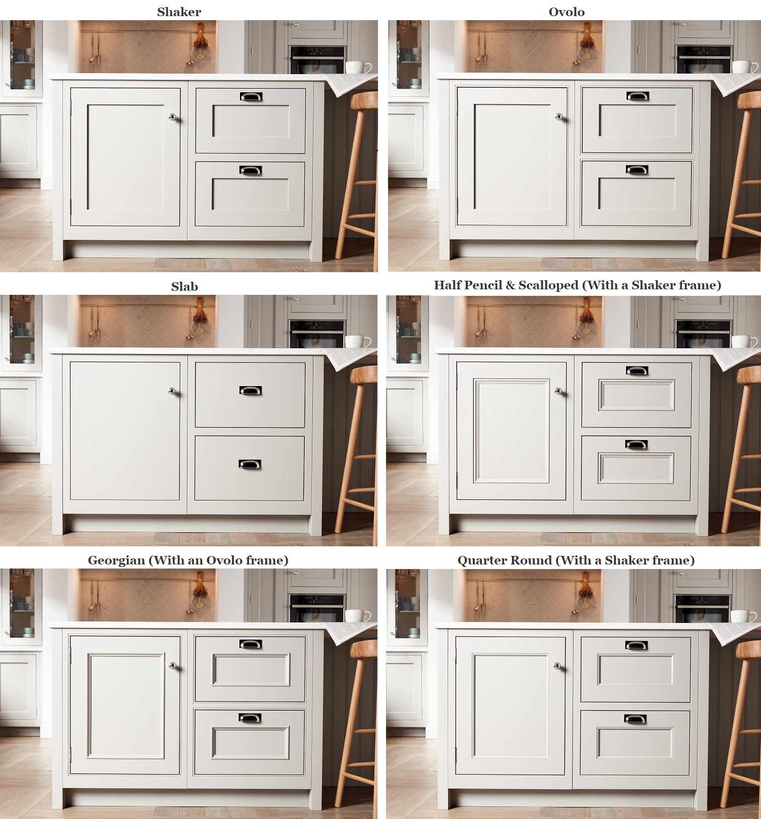 Quarter Round Linear, Quarter Round, Half Pencil & Scalloped and Georgian are all beading options available in the Ovolo door design to bring an extra intricate detail to your kitchen.