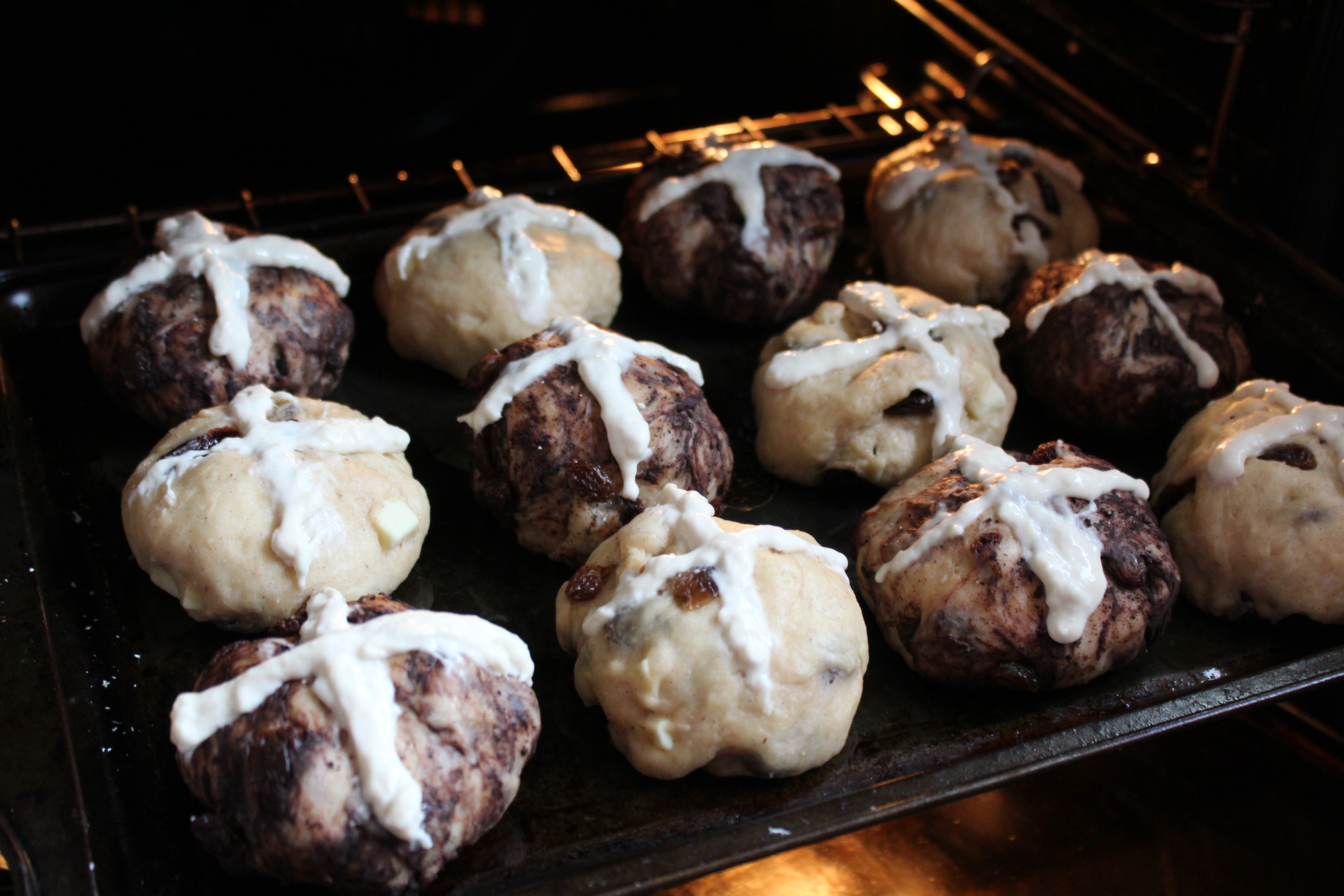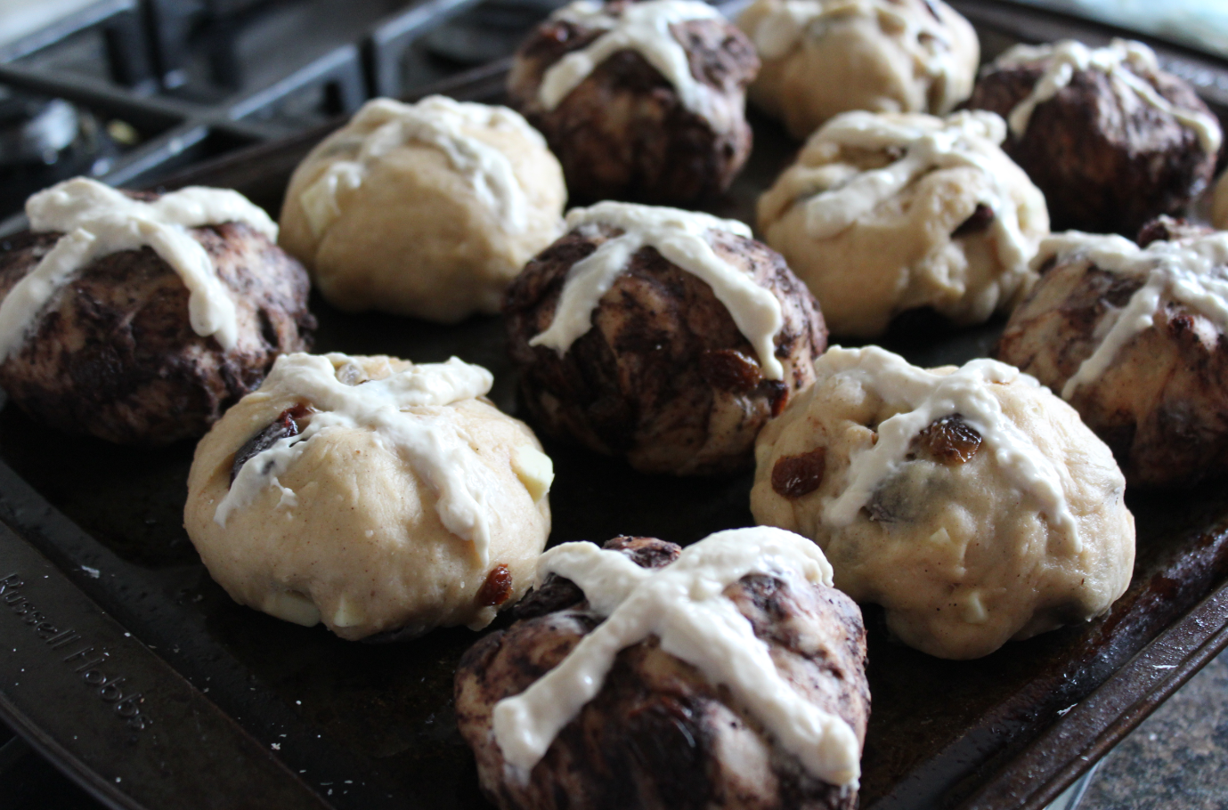 Mix 100g of the strong white flour with approximately 90ml of water to create a thick paste, then add this mixture to a piping or sandwich bag and snip a small piece from the corner. If your buns have had enough time to prove, remove the clingfilm and carefully pipe a cross onto each.