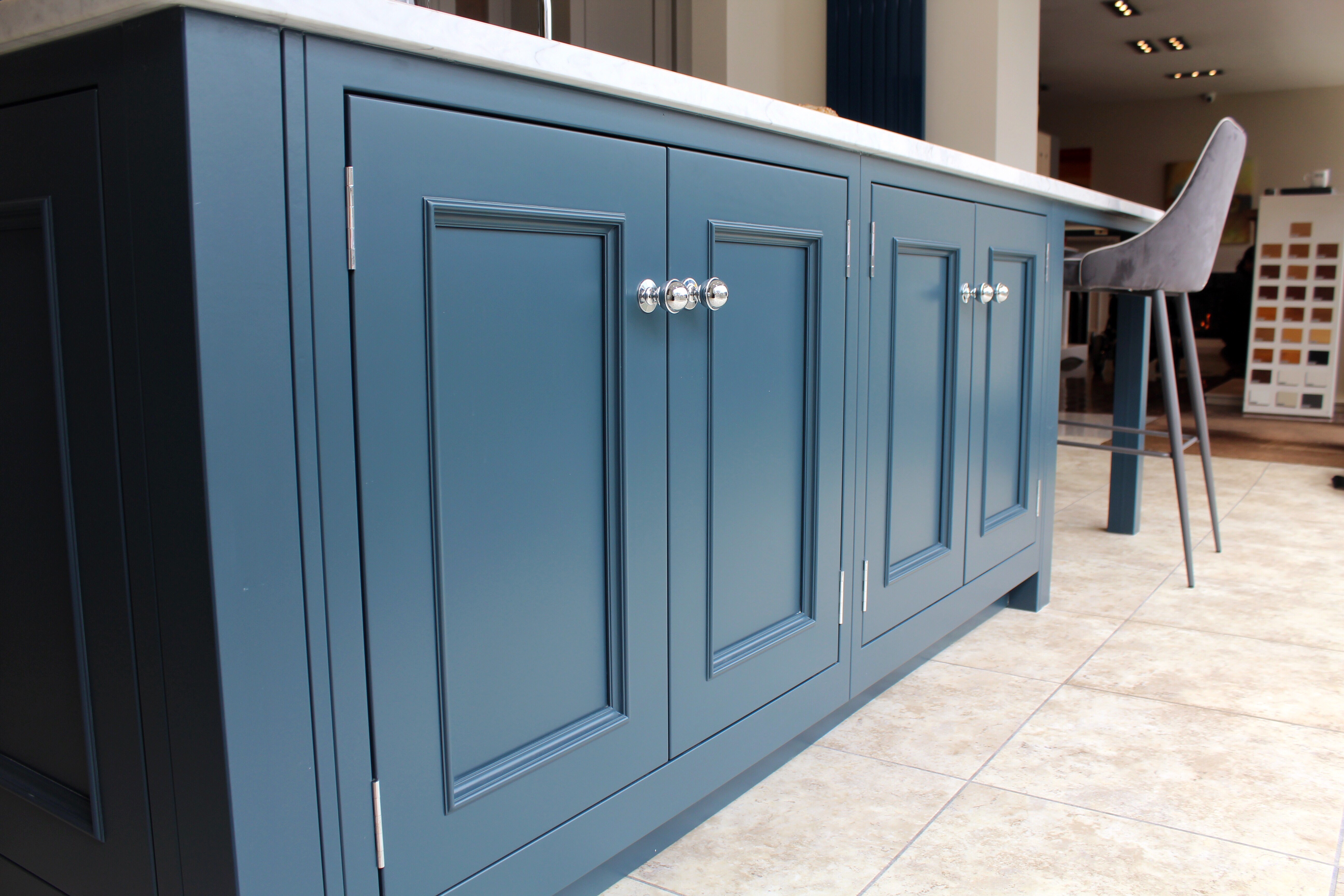 Dark colours are set to be big this year, like Hartforth Blue and Copse Green from 1909. They’re perfect for creating a sophisticated statement alongside a more neutral palette. We’re so happy that we chose Hartforth Blue for the feature island in our new display- it pairs beautifully with Putty and has seen a lot of interest!