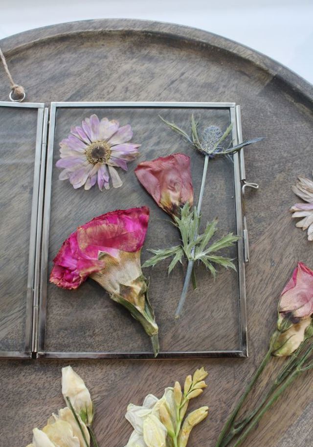 From here, select which of your flowers have kept their vibrancy the most, and arrange in your open glass frame. Make sure you’ve made the right decision before closing the frame as flowers may be hard to remove once compressed.